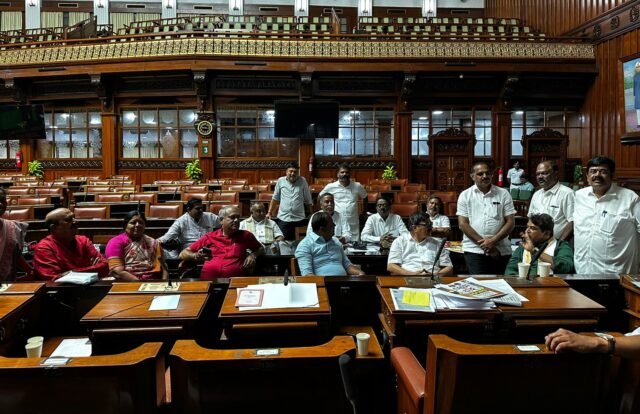 ಅಬಕಾರಿ ಇಲಾಖೆಯಲ್ಲಿನ ಭ್ರಷ್ಟಾಚಾರದ ಕುರಿತಾಗಿ ಇಂದು ನಡೆದ ಚರ್ಚೆಯ ಸಮಯದಲ್ಲಿ ಸಚಿವ ಆರ್.ಬಿ. ತಿಮ್ಮಾಪುರ ನೀಡಿದ ಉತ್ತರಕ್ಕೆ ವಿಪಕ್ಷಗಳಾದ ಬಿಜೆಪಿ ಮತ್ತು ಜೆಡಿಎಸ್ ತೃಪ್ತವಾಗಿಲ್ಲ. ಹಾಗಾಗಿ ಅಹೋರಾತ್ರಿ ಧರಣಿ ನಡೆಸುತ್ತಿವೆ.ಸದನ ಮುಂದೂಡಲ್ಪಟ್ಟ ಬಳಿಕ ಎರಡೂ ಪಕ್ಷಗಳ ಶಾಸಕರು ವಿಧಾನಸಭೆಯಲ್ಲೇ ಉಳಿದ್ದಾರೆ. ಧರಣಿ ನಿರತ ಶಾಸಕರಿಗೆ ರಾತ್ರಿಯ ಭೋಜನ ಮತ್ತು ಮಲಗಲು ಹಾಸಿಗೆ ವ್ಯವಸ್ಥೆ ಕಲ್ಪಿಸಲಾಗಿದೆ. ಕಲಾಪವನ್ನು ನಾಳೆ ಬೆಳಗ್ಗೆ 10 ಗಂಟೆಗೆ ಮುಂದೂಡಲಾಗಿದ್ದು, ಸ್ಪೀಕರ್ ಯು.ಟಿ. ಖಾದರ್ ಮತ್ತು ಡೆಪ್ಯುಟಿ ಸ್ಪೀಕರ್ ರುದ್ರಪ್ಪ ಲಮಾಣಿ ಧರಣಿ ನಿರತ ವಿಪಕ್ಷಗಳ ಶಾಸಕರನ್ನು ಭೇಟಿ ಮಾಡಿ ಮನವೊಲಿಸುವ ಪ್ರಯತ್ನ ಮಾಡಿದ್ದಾರೆ.